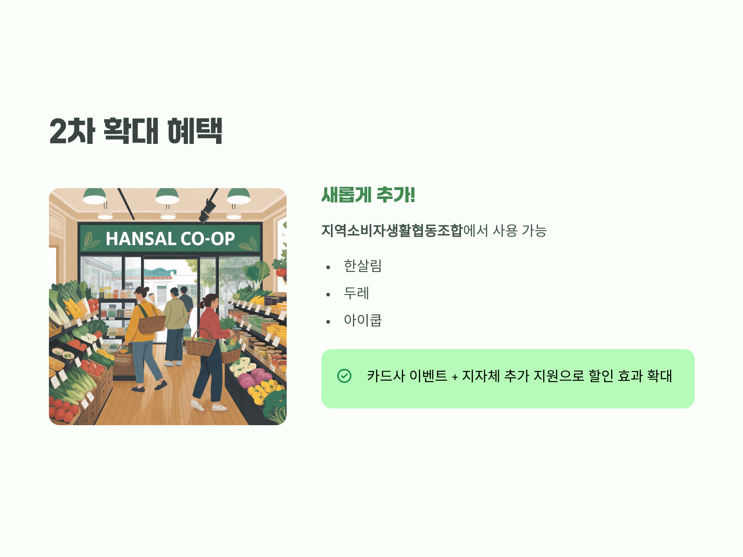 특히 이번 2차부터는 지역소비자생활협동조합(한살림, 두레, 아이쿱 등)에서도 사용이 가능해 소비자들의 체감 혜택이 크게 늘어날 전망입니다.