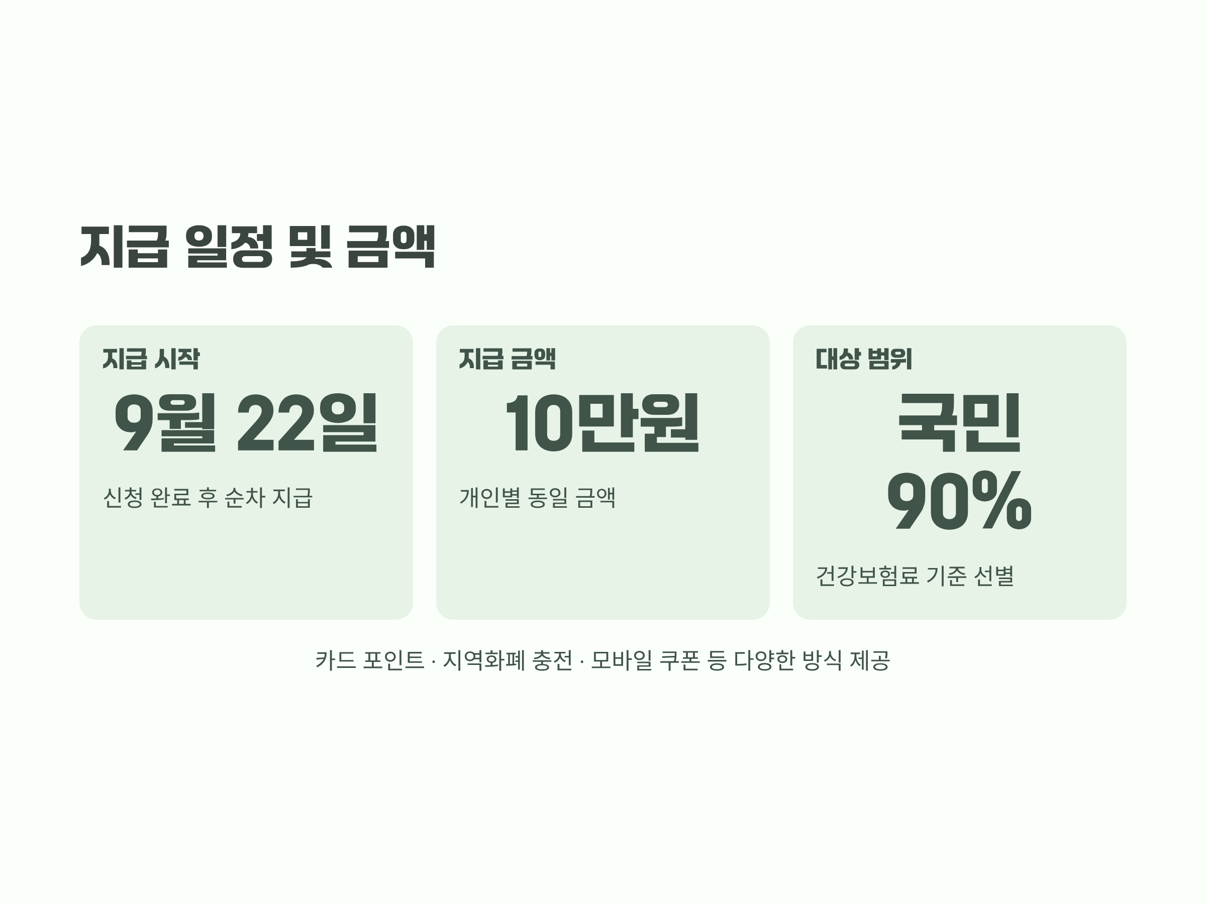 지급은 신청 완료 후 순차적으로 이뤄지며, 카드 포인트 적립·지역 화폐 충전·모바일 쿠폰 등 다양한 방식으로 제공됩니다.