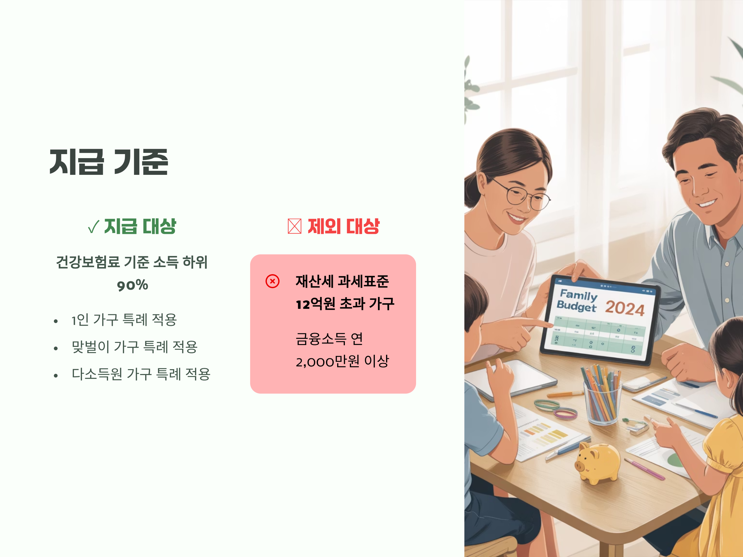 다만 1인 가구, 맞벌이 가구, 다소득원 가구 등 특수한 경우에는 특례 조항이 마련되어 형평성을 보완할 예정입니다.