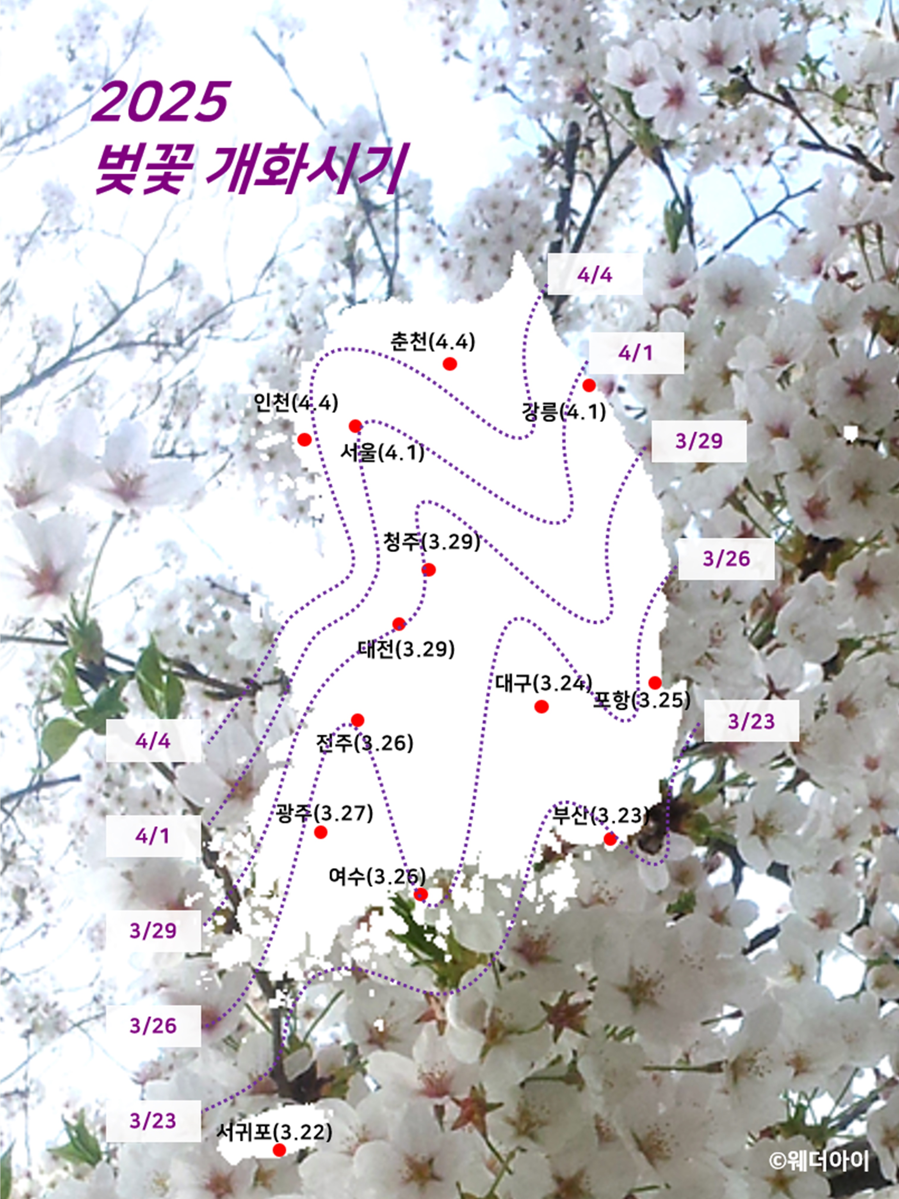 벚꽃 개화는 3월 기온 변화에 큰 영향을 받습니다. 따라서 예상 시기와 실제 개화 시기에 다소 차이가 있을 수 있다는 점을 참고해주세요.