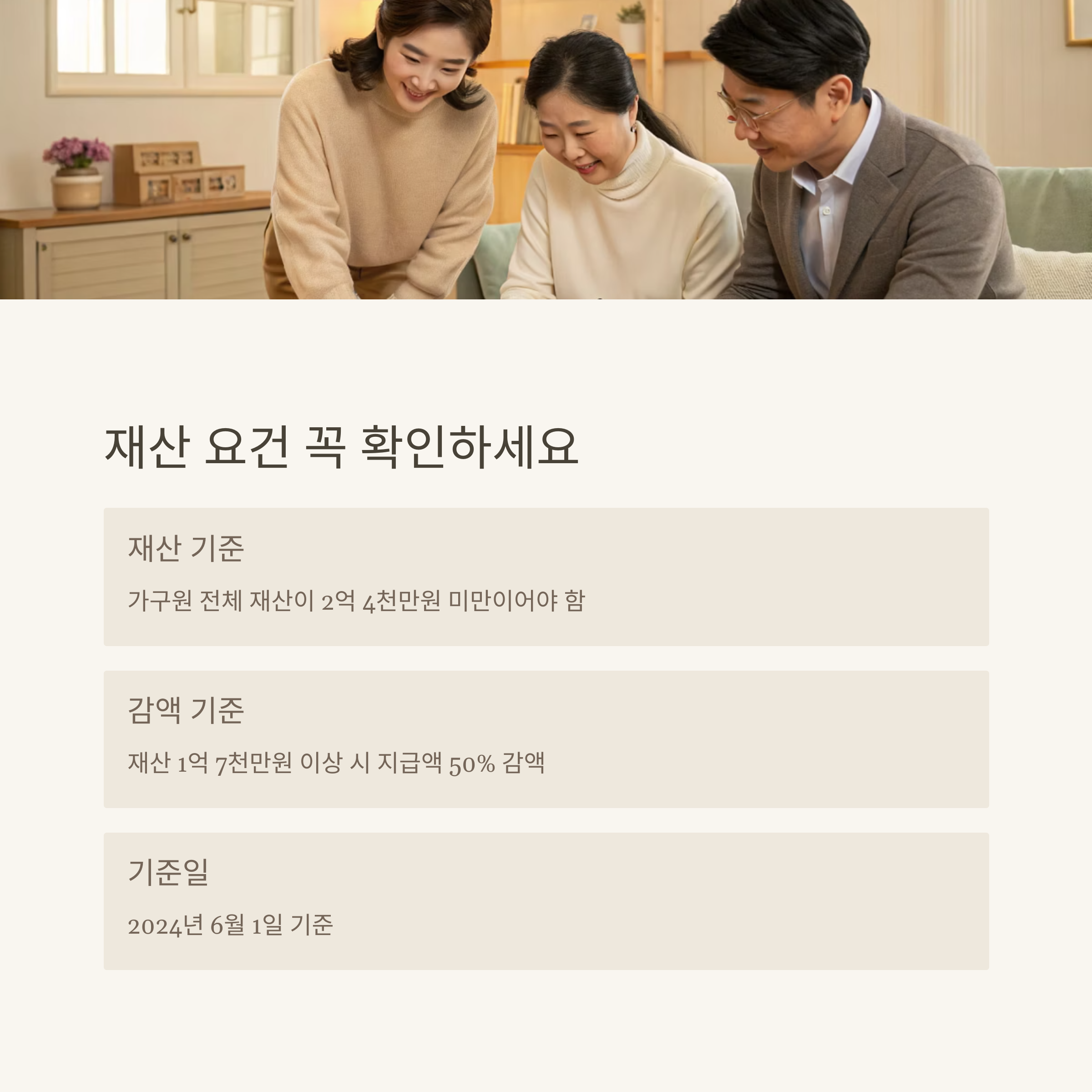| 재산 요건 | 2억 4천만 원 미만, 감액 기준 있음 |