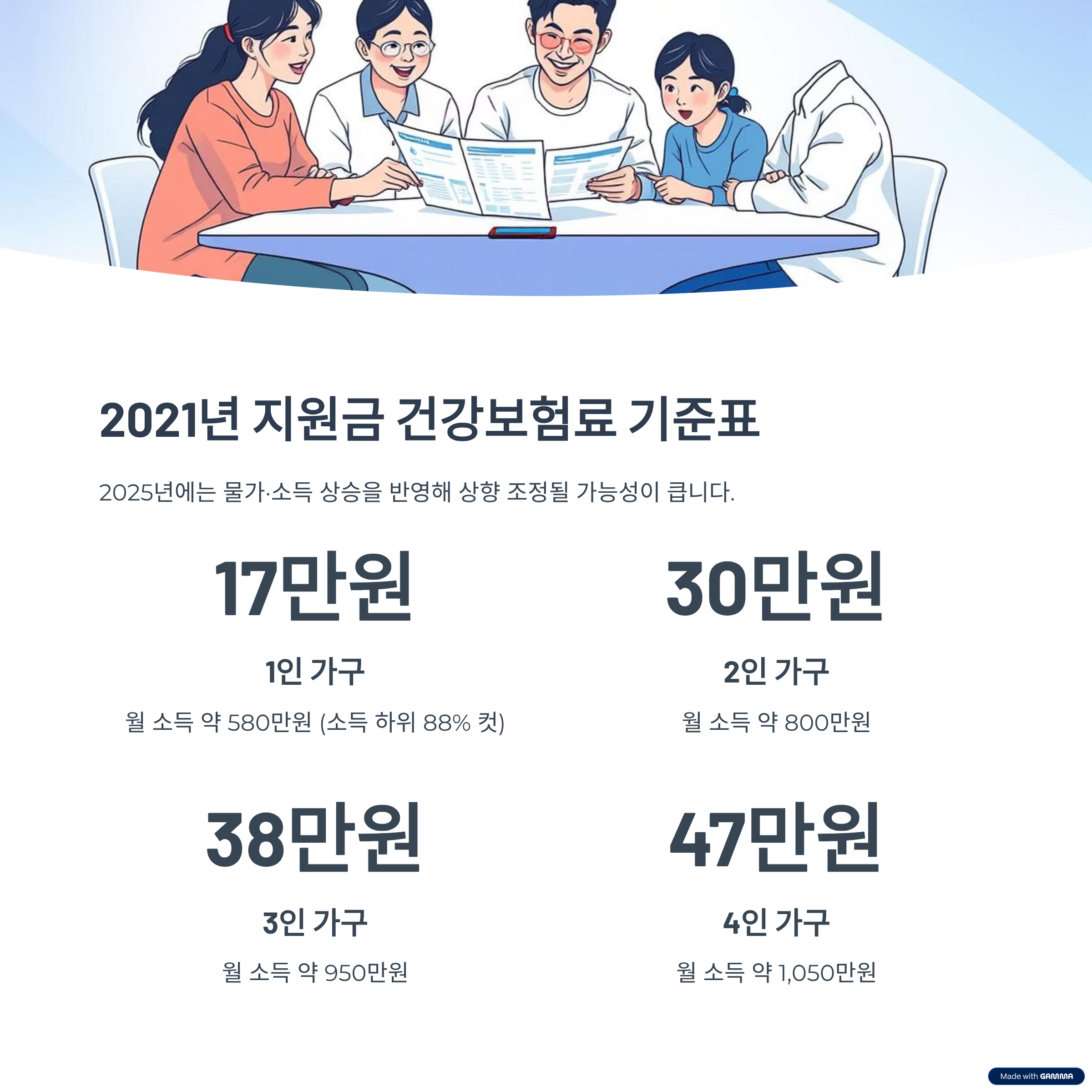 | 가구원 수 | 건강보험료 기준(직장가입자) | 월 소득 환산액 | 비고 |