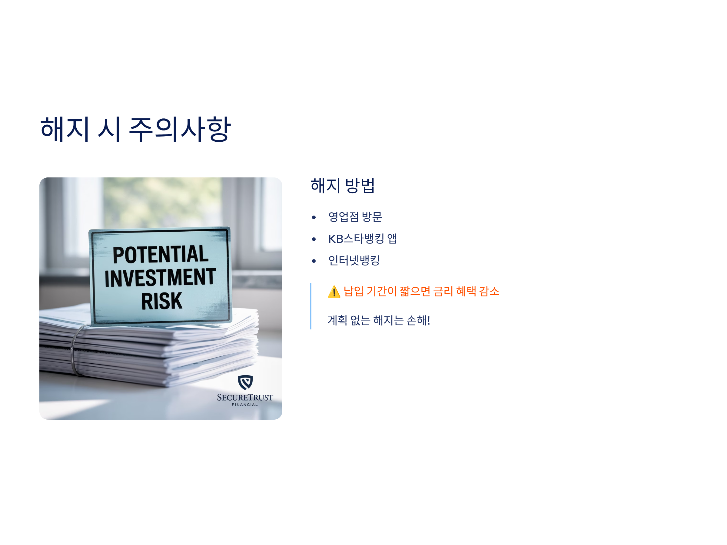 해지 방법은 영업점·앱·인터넷뱅킹 모두 가능하며 간단합니다. 다만, 납입 기간이 짧으면 금리 혜택이 줄어들 수 있어 계획 없는 해지는 손해가 될 수 있습니다.