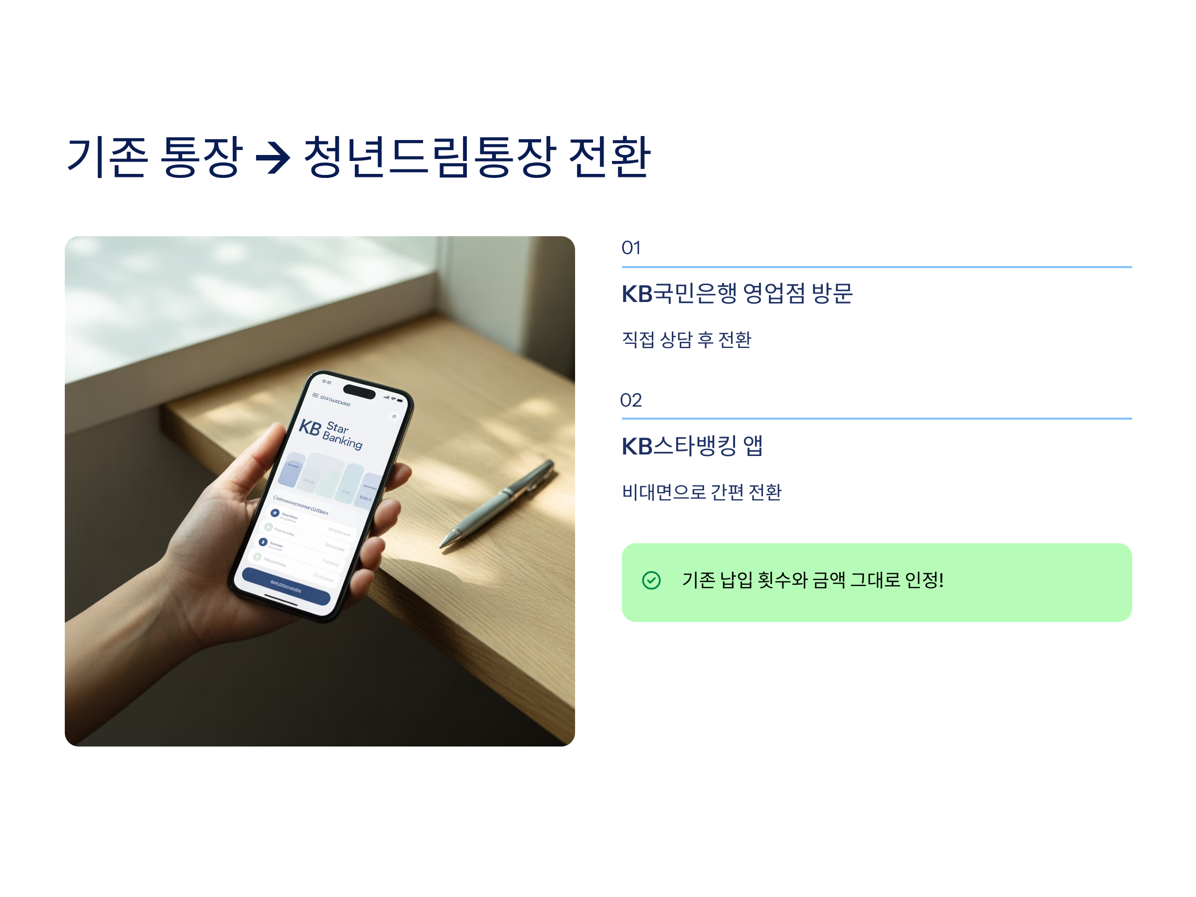 전환 시 기존 납입 횟수와 금액은 그대로 인정되므로 새로 시작하는 부담이 없습니다. 전환과 동시에 금리 우대와 상품 혜택이 적용되니, 청년층이라면 전환을 검토할 만합니다.