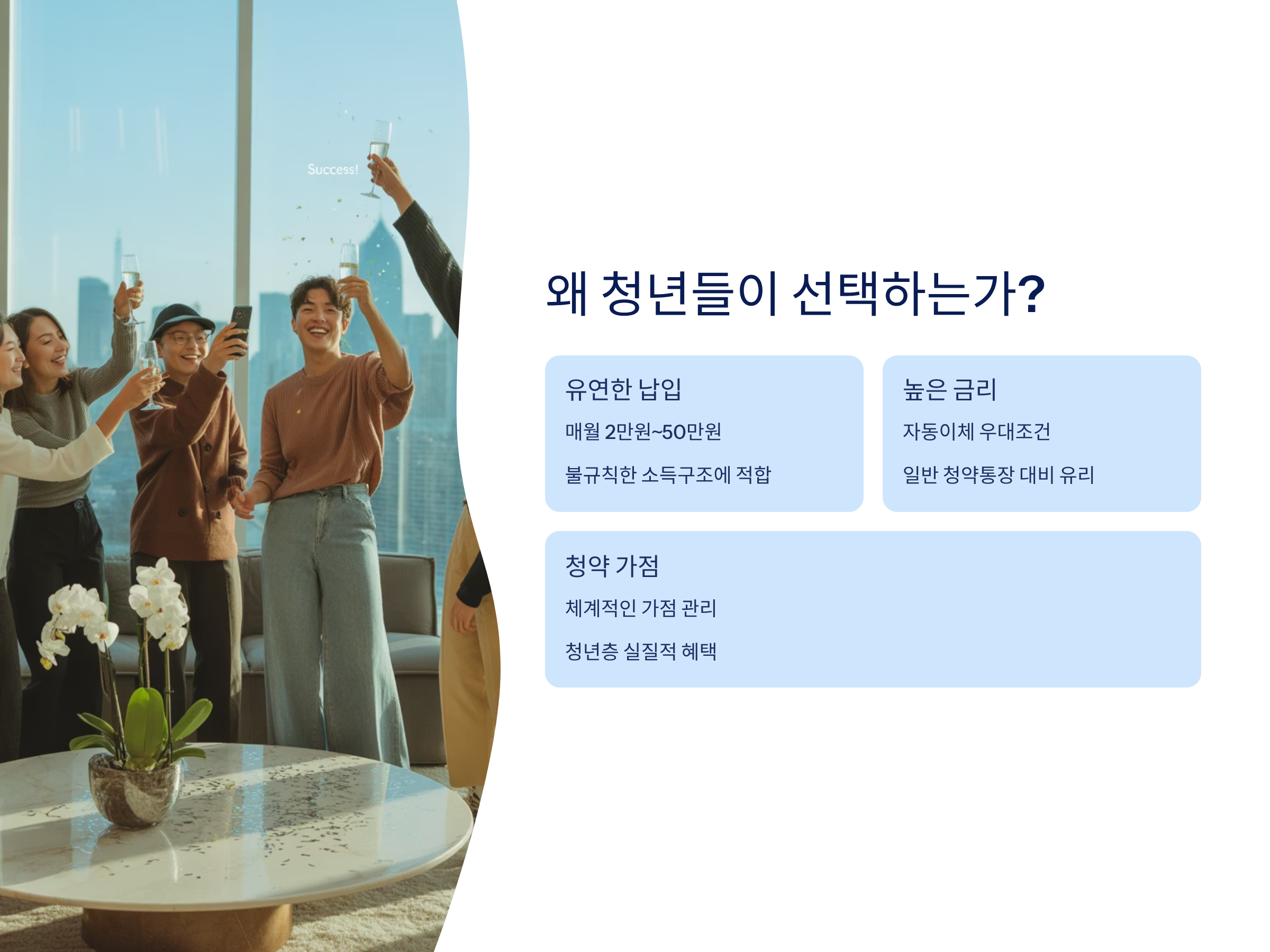 특히 청약 가점 관리가 중요한 청년층에게 실질적인 혜택을 주며, 일반 청약통장 대비 유연성이 큽니다.